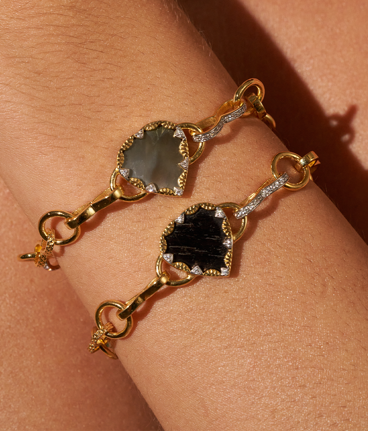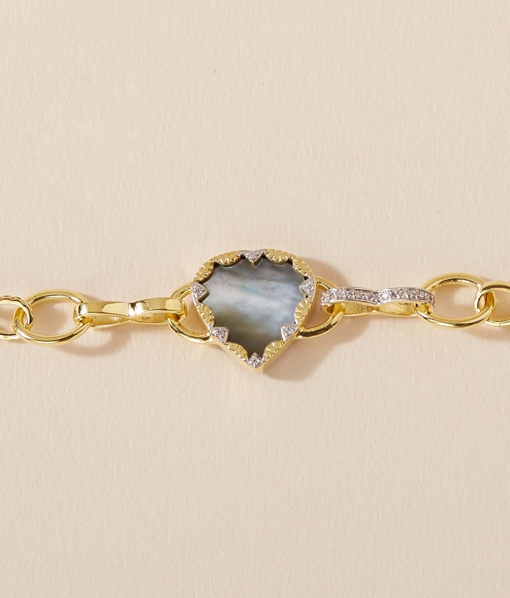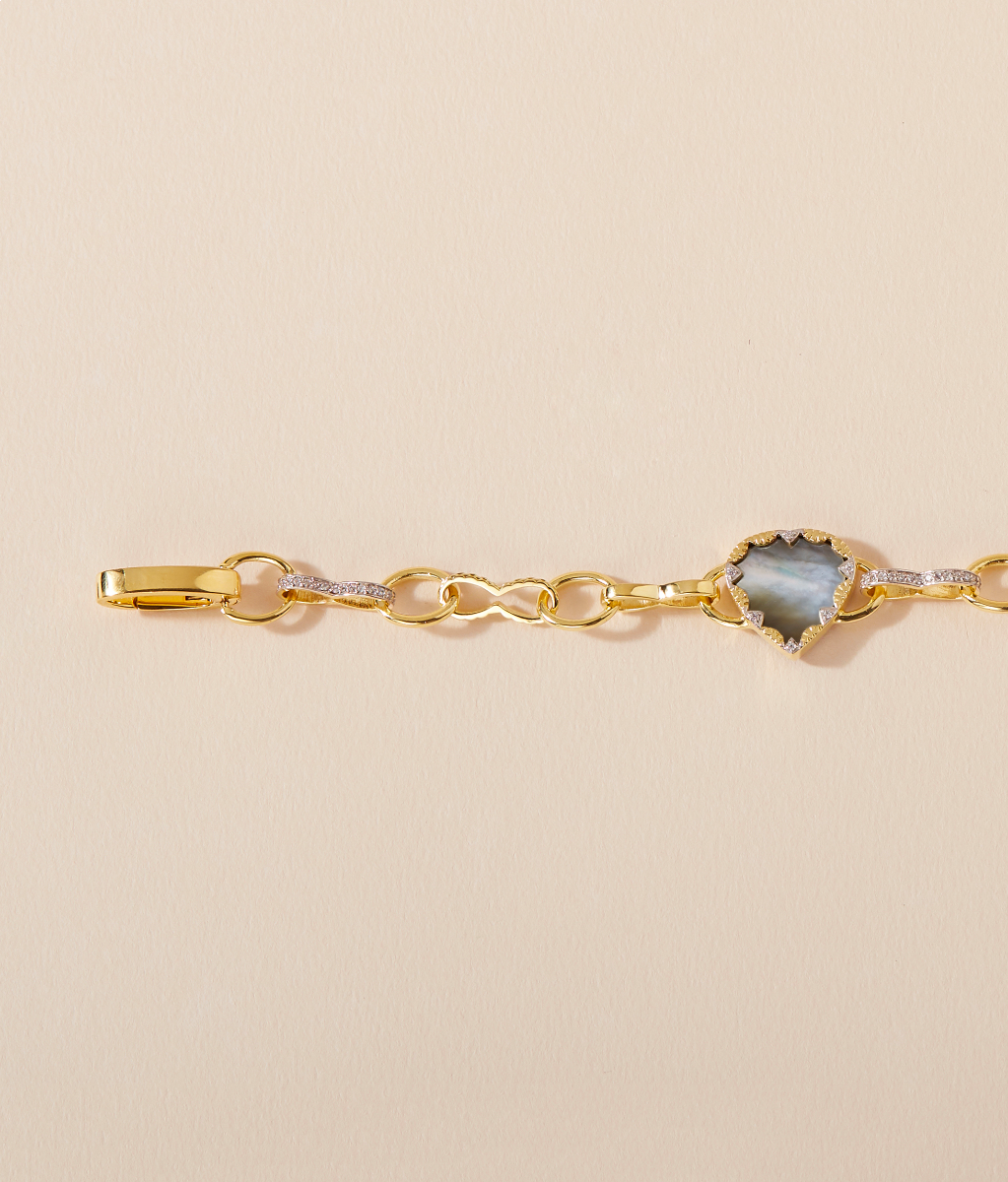 Bracelet en plaqué or orné d'une pierre en nacre grise. Chaîne de 15,5cm, ajustable sur 3cm.