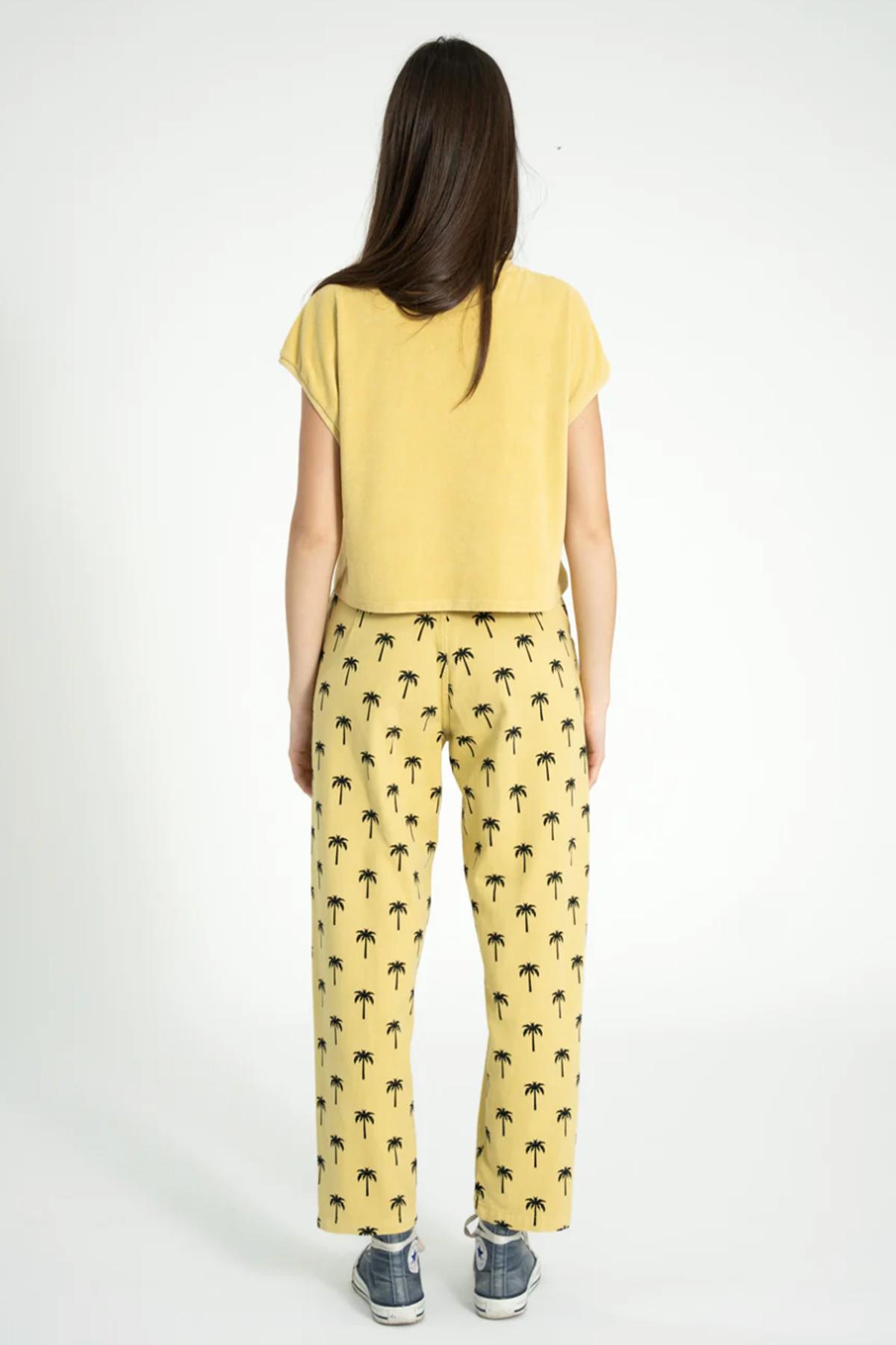 Sisters Department - Pantalon Palm trees, pantalon jaune taille haute boutonné à motifs de palmiers. Poche avant et logo brodé discret.